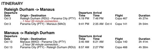 The team arrived in Manaus early this morning. They spent some time shopping in the grocery store and in the outdoor market before heading to the hotel. They'll have a nice dinner tonight before going back to the hotel for a late nap. Their flight leaves at 3:40am tomorrow morning. They'll layover in Panama before arriving to Raleigh around 2:30pm.
